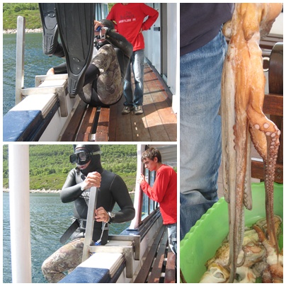 Veneen kapteenikin heitti märkäpuvun niskaan ja lähti sukeltelemaan! Parisen tuntia hän siellä viihtyi ja palatessaan näytti saalistaan: vyöllä roikkui melkoinen läjä mustekaloja. Hihoihin hän oli kerännyt simpukankuoria, jotka kimaltelivat kauniin hopeisina auringossa. Hän kertoi että mustekalat imevät simpukan sisuksen, tästä syystä kuoret kimaltelevat niin upeasti. Hän jakoi simpukankuoret meille naispuolisille vieraille muistoksi :).