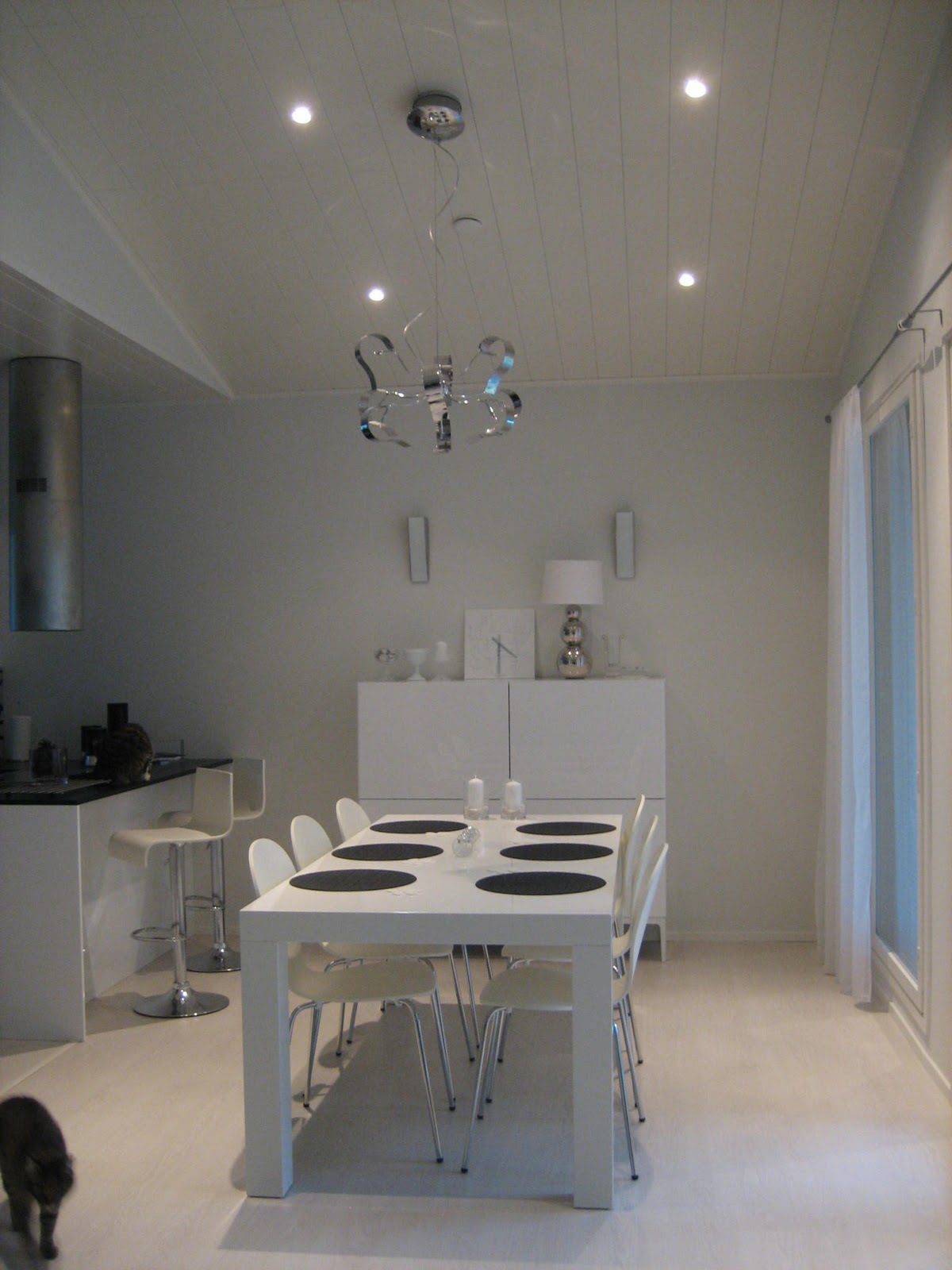 >Hobgoblin: kiitos paljon kommentistasi! mä aattelin laittaa ne mustat verhot vielä ikkunaan, mut en muuta mustaa ehkä tällä kertaa. ei se täällä ruokailutilassa ollessa näytä liian valkoiselta ja vieressä on keittiö, jossa on mustaa tasoa monta metriä :)
