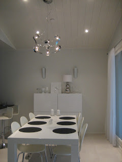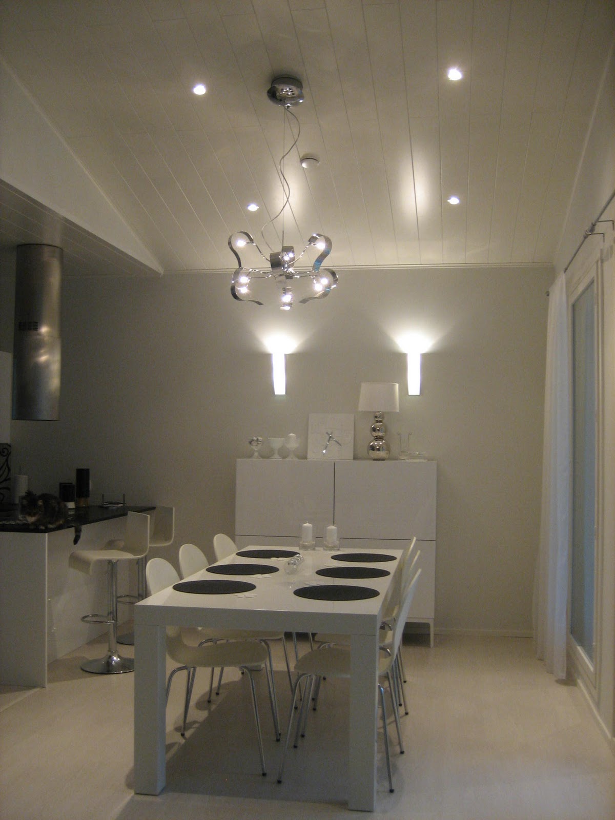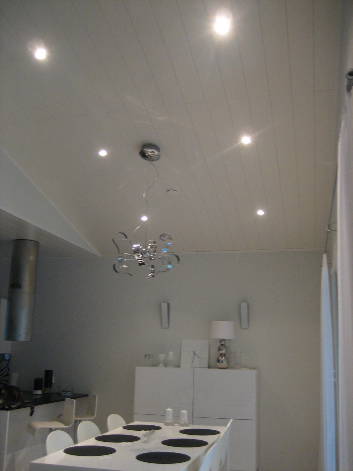 Esittelen tässä samalla ruokailutilan valaistuksen. Katosta löytyy spotteja ja päävalaisin: