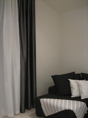 Vielä vois lisätä pari harmaata (verhojen sävyistä) tyynyä valkoisten kaveriks.