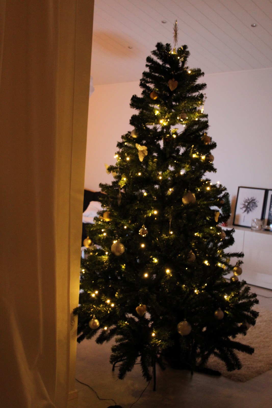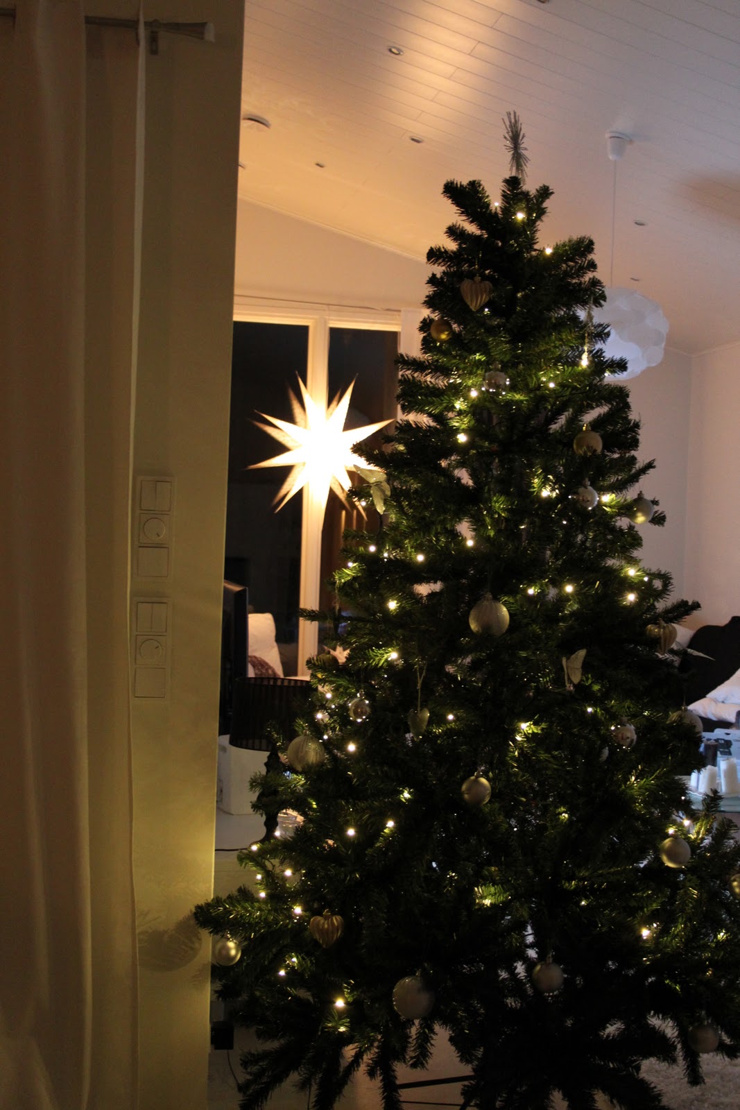 Päädyin tähän kuusen paikkaan, koska tästä kuusi näkyy moneen suuntaan. Varsinkin ruokapöydästä on aivan ihana katsella joulukuusta <3.
