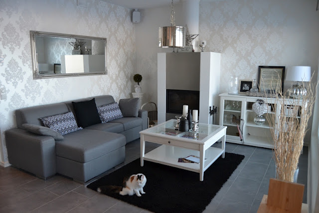 Kotimme sisustuksessa on pääväreinä käytetty valkoista, harmaata ja mustaa. Vuosi sitten muuttomme aikoihin olin totaalisen sekaisin tulevan sisustuksemme suhteen, pidin sekä modernista että maalaisromanttisesta sisustuksesta. Nyt olenkin alkanut katumaan takkahuoneen sisustusta, jonka haluaisin mahdollisimman moderniksi ilman että kalusteita pitäisi vaihtaa (mieheni ei oikein aina innostu muuttuvista mielipiteistäni :)).