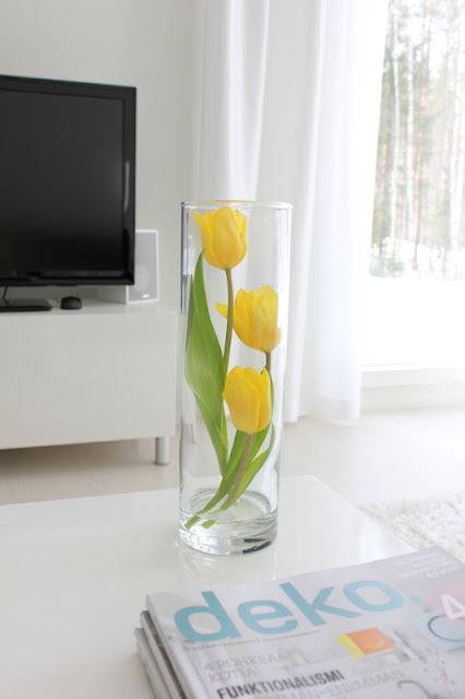 Tuli ihanat! Mulla on näitä korkeita ja kapeita maljakoita kaksi, vois olla tosi kivat pääsiäispöydän koristeina. Ja tosi kauniit myös silloin, jos maljakossa olevat tulppaanit on kaikki eri värisiä: yksi keltainen, yksi lila ja yksi pinkki! :)