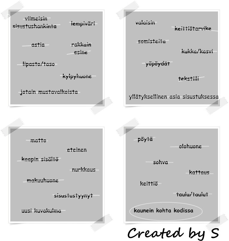 Tämä postaus päättää sisustuskuvahaasteeni, mukava tätä oli tehdä ja tulipahan kuvattua myös sellaista, mitä ei ehkä muuten olisi kuvannut :). Oletteko te tykänneet seurata tätä?