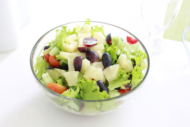 Pöytä on katettu ja salaatti tehty, enää vieraat puuttuvat ja sitten ruoka uuniin. Meillä syödään tänään yhtä lempparia: hunajabroileria hunajakermakastikkeessa jasmiiniriisin kera. Salaatissa vihersalaatin lisäksi kurkkua, paprikaa, kirsikkatomaattia, ananasta ja vihreitä & tummia viinirypäleitä. Pähkinäsekoituksen lisään salaattiin vasta vähän ennen tarjoilua, ettei pähkinät pehmene liikaa.