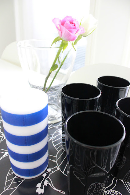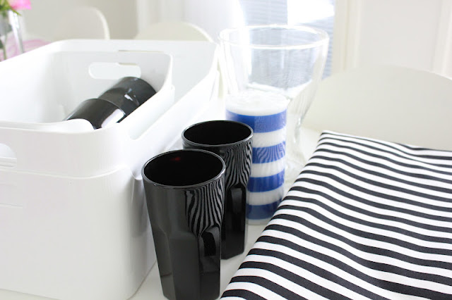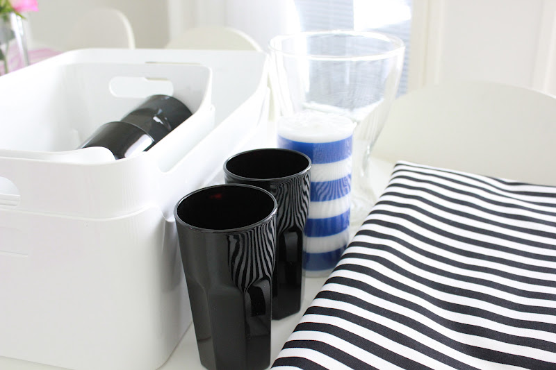 Lisää valkoisia säilytyslaatikoita kaappien/laatikoiden sisuksiin, mustia laseja kesäisten virvokkeiden nautiskeluun, kauniin raikas raitakynttilä, josta saa muuten simpukoiden ja/tai kivien kera ihanan asetelman! (Kaikki ostokset Ikeasta.)