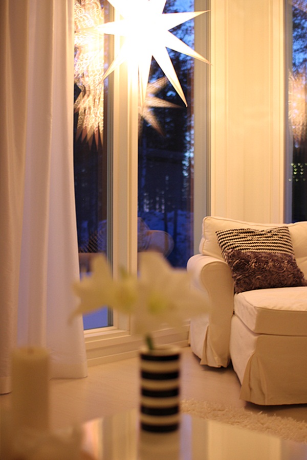 Askarreltiin (kyllä me, sillä sain houkuteltua miehen seurakseni :D) myös paperitähtiä: kaksi valkoista ja yksi mustavalkoinen. Laitan teille kuvia joku päivä kun saan ne ripustettua ja kuvattua! Nyt ne on vielä kuivumassa tuossa pöydällä. Harkitsen niiden tekemistä vielä pienempinäkin versioina, jotta voisin ripustaa ne huonekuuseeni. Noh, jää nähtäväksi; noiden kolmenkin tekoon hurahti reilu tunti ja mitä pienempi tähti, sen hankalampaa niitä on väkertää ;)