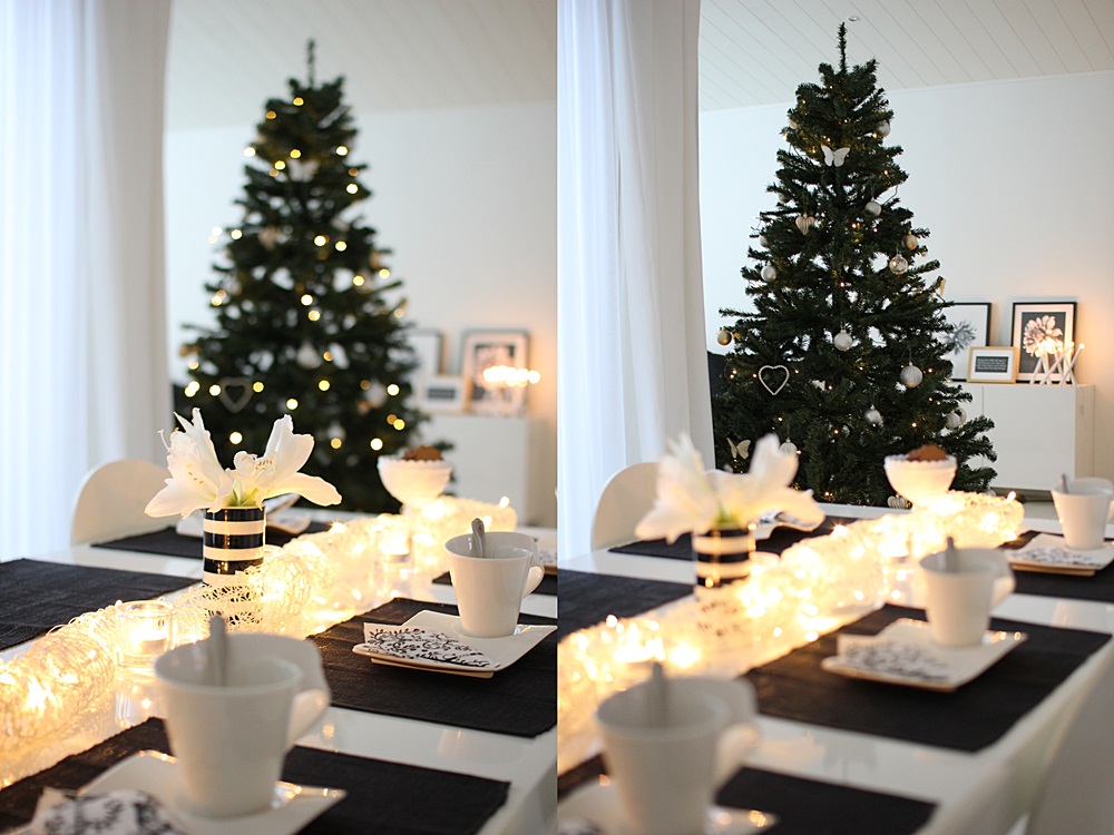 En meinannut malttaa odottaa, että saan köynnöksen osaksi kattausta ja viime viikolla se pääsikin heti testaukseen. Aika kiva! Pimeälläkin valaisee hyvin. Kukaan vieraistani ei glögikattauksen äärellä edes ihmetellyt, mistä valoköynnös saa virtaa, heh! Teippasin valojohdon sitten varmaan melko huomaamattomasti: ensin pöydän jalkaan ja sitten lattiaan teipillä kiinni (ettei siihen kukaan kompastu), ylimääräinen johtokasa lipaston alle ja virtaa pistorasiasta lipaston vierestä. Kätevää! Ja ainahan voi käyttää paristoilla toimivia valoja, jos ei ole pistorasiaa lähettyvillä.