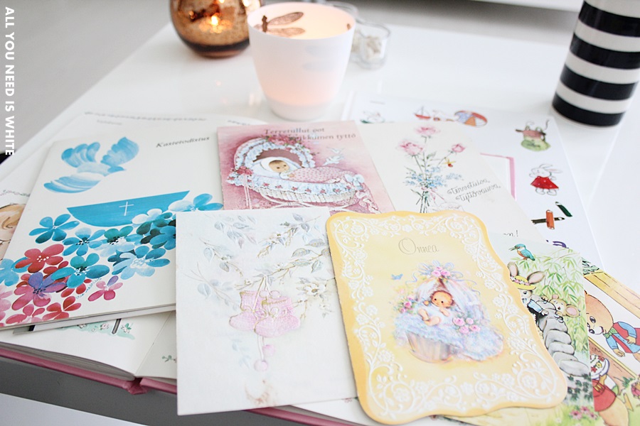 Kirjan välistä löytyy myös muutamia tallessa säilyneitä onnittelukortteja, joita saimme synnyttyäni sekä ensimmäisinä syntymäpäivinäni.