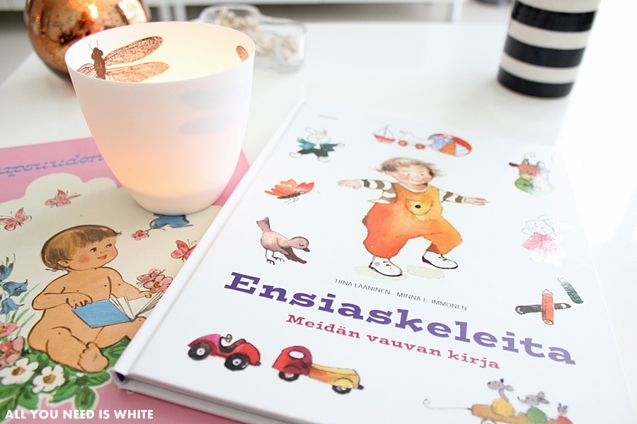 Ihan ensimmäinen asia, jonka ostin vauvallemme, on tämä kuvassa näkyvä valkokantinen kirja. Kipaisin Suomalaiseen Kirjakauppaan jo syyskuussa (ennen Mallorcan matkaamme ja pohjeluuni murtumaa); ensimmäisellä kerralla ainoastaan katsastin valikoiman ja seuraavalla reissulla uskaltauduin jopa jo ostamaan kirjan. Koko ajan ympärilleni vilkuillen, ettei kukaan tuttu vain näe mitä ostan… Tekosyykin oli valmiina mielessä, jos näin olisi käynyt! :D