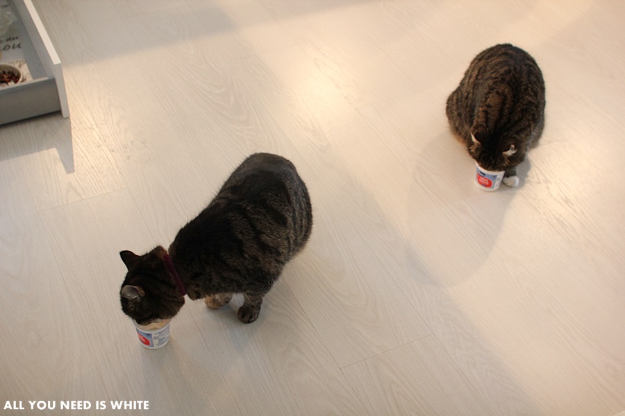 Niin ihania kisuleita taas <3 Tuo asento on ihana, pylly pitkällä lipitetään purkkia. Hah, ja molemmilla omat purkit, tottakai :) Ihanaa viikonloppua!