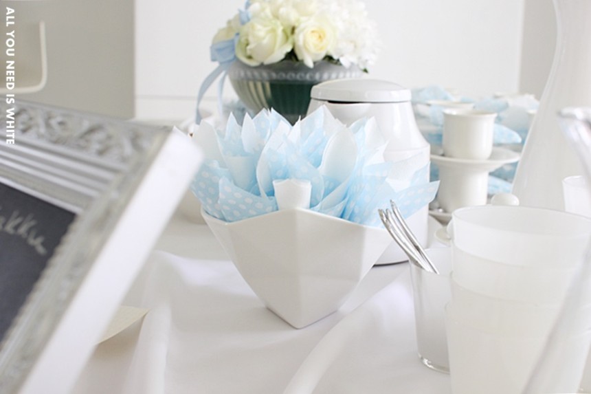 Pöytäliinaa pähkäilin, en oikein innostunut ajatuksesta ostaa sellaista, koska niin harvoin sellaista tarvitaan. Kastepöytään liina löytyi äidiltäni; kaunis ja läpikuultava kukkakuvioinen. Tarjoilupöydän liina muodostui kaappini antimista: valkoisesta lakanasta, jonka päälle asettelimme valkoiset voilee-verhoni. Ne sopivat hyvin yhteen tilan saman materiaalin verhojen kanssa. Alimmainen voilee-kangas peitti lakanan alleen täysin ja päällimmäisen halusin pöydän keskelle tuollaiseksi kapeammaksi suikaleeksi. Hopeisesta nauhasta pienet rusetit molempiin päihin ja näin juhlapöydän pohja oli valmis:
