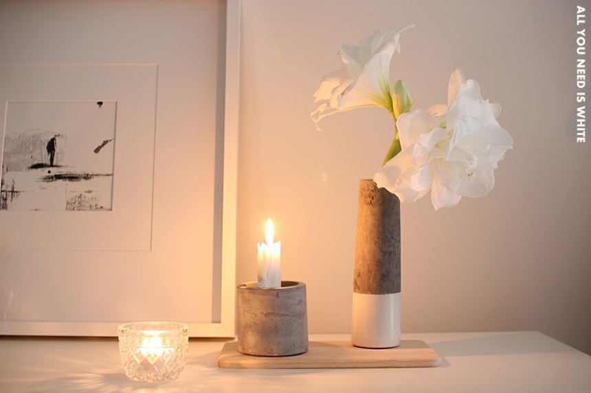 Tuon betonisen kynttilänjalan ostin heinäkuun helteillä Clas Ohlsonilta. Sitä näkeekin nyt paljon blogeissa. Se on kätevä, sillä siinä voi polttaa sekä kruunukynttilää, lämpökynttilää että pöytäkynttilää! Jälkimmäisen kanssa on tällä hetkellä mun lemppari.