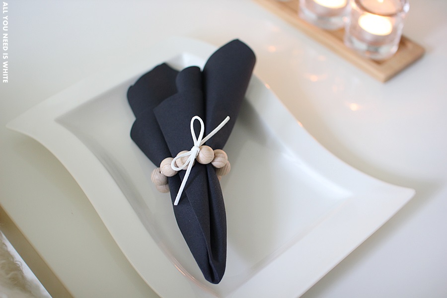 Puuhelmien lumoissa, tämä täällä! Pyöräytin niitä mokkanauhan ympärille ja solmin kiinni lautasliinan ympärille: