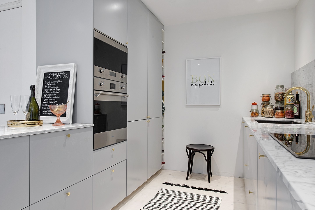 Itse kuulun siihen joukkoon, joka tykkää marmorista aika paljonkin, mutta näkisin sitä vain pieninä ripauksina. Esim. jos marmori suojaa välitilaa, taso on jotain muuta. Jos taas keittiössä on marmoritaso, välitila olisi sitten jotain muuta. Tässä keittiössä on sekä marmorinen välitila että taso, myöskin kaapistojen sivut on peitetty marmorilla :). Joka tapauksessa riitti taas herättämään haaveilun valkoisesta keittiön tasosta nykyisen mustan tasomme sijaan…