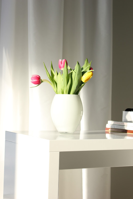 Tämä viikko on ollut melko tulppaanintäyteinen, olette kenties sen huomanneetkin ;). Tämä viikko on ollut mulle (muutamastakin asiasta johtuen) myös melko kiireinen, mutta ensi viikolla luvassa sitten taas enemmän muutakin sisustusjuttua! Tosin en missään nimessä mene lupaamaan, että nämä tulppaani-/aurinkokuvat oli tässä :D.