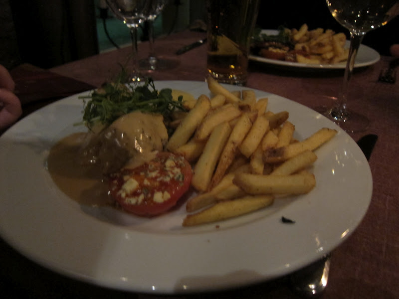 Kuva on surkea, mutta mun lautaselta löytyi kananrintaa kermaisessa amarettokastikkeessa maalaistikkuperunoiden kera, miehen lautaselta possua.